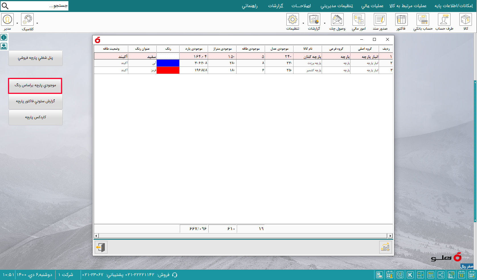 ✓ گزارش موجودی پارچه بر اساس طاقه و رنگ