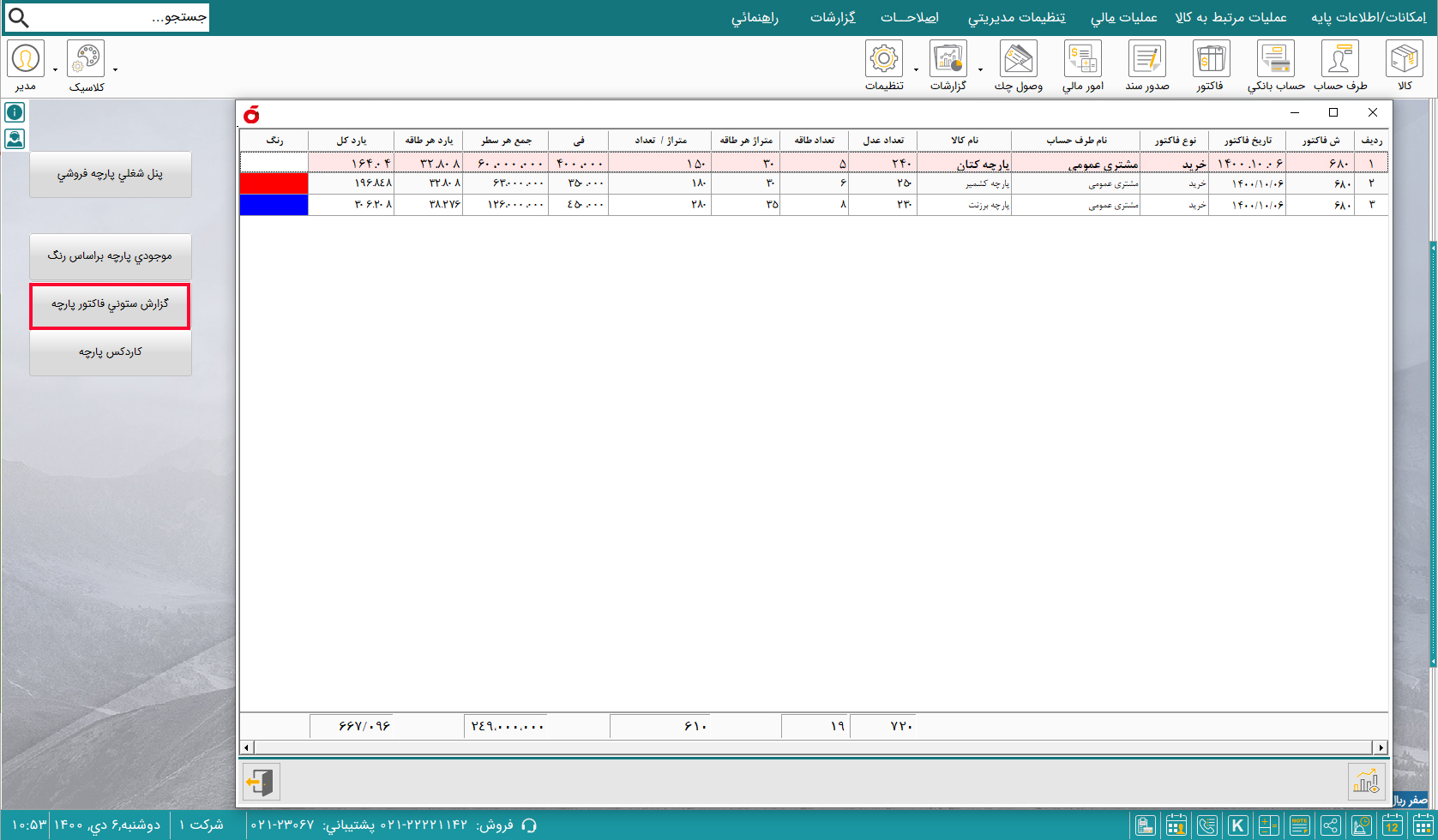 ✓ گزارش آماری از مبالغ فاکتورها، بدهکاری یا بستانکاری طرف حسابها، میزان خرید و فروش ماههای سال، موجودی ریالی و تعدادی پارچهها، سود ماهیانه و …